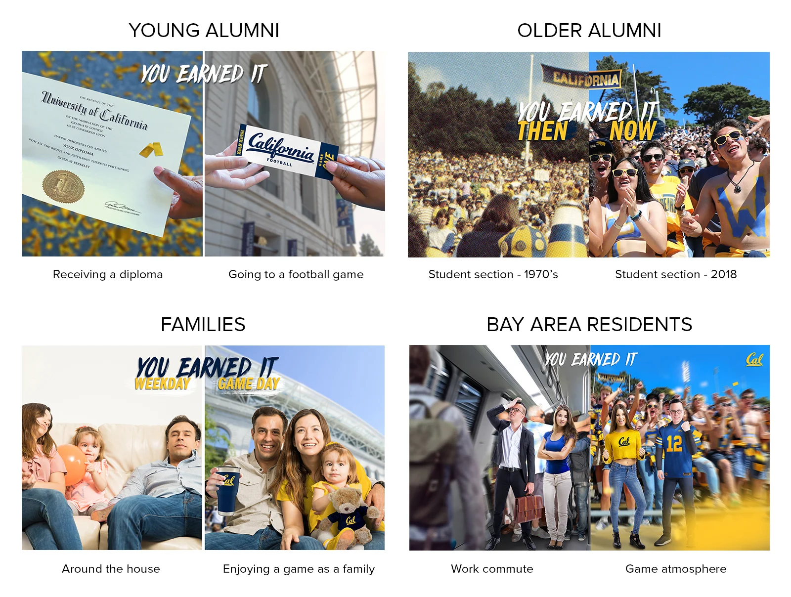 Every young family has a distinct set of daily challenges. On the left of the ad I presented a family that looked like they were in the middle of a long, tiresome week. As your eyes move to the right, you see a family that’s happy, engaged, and having fun enjoying Cal game day. It shows that a game day experience at Cal is enjoyable for everyone in the family. This is the same strategy used for all demographics that we were targeting.